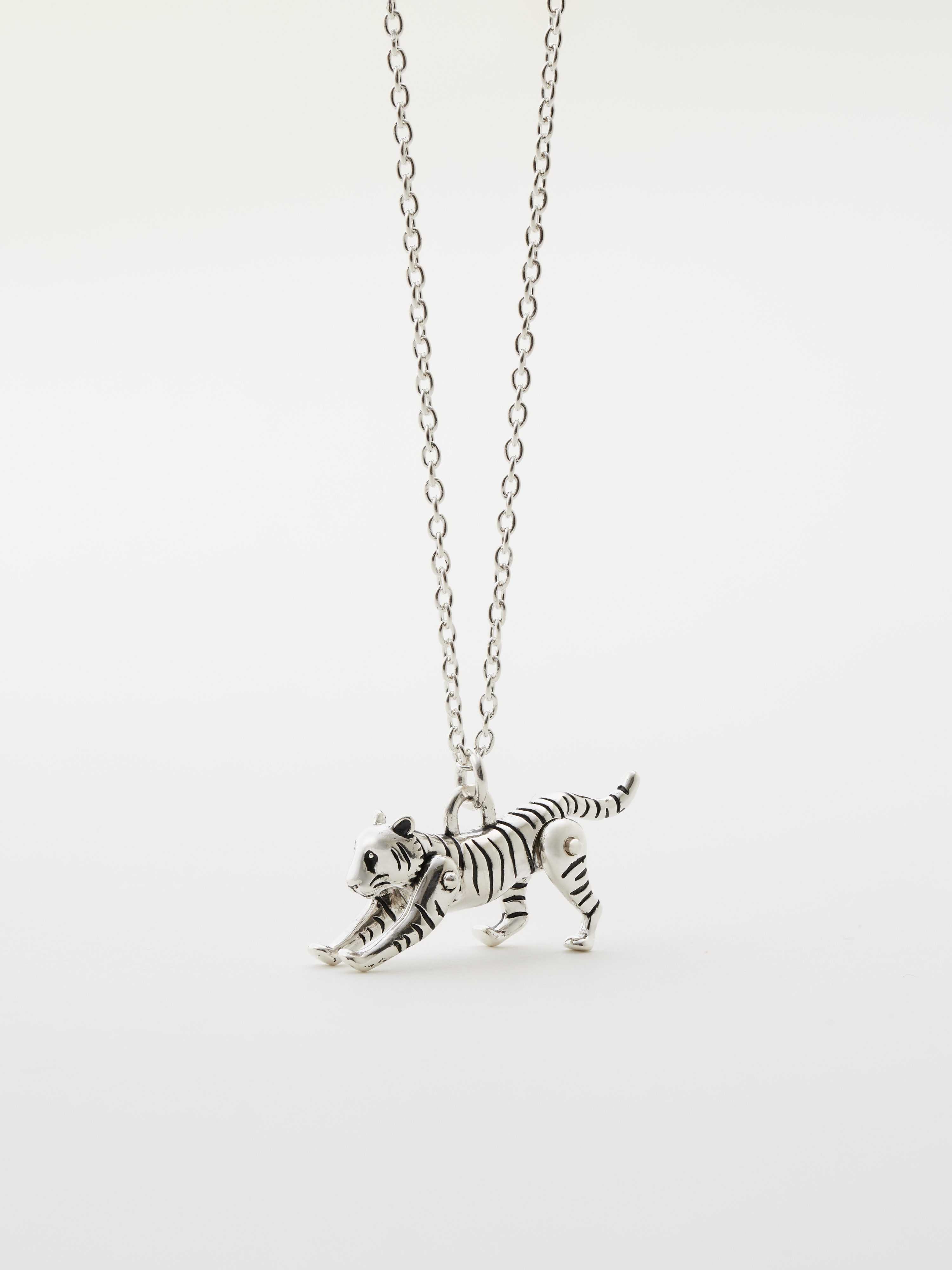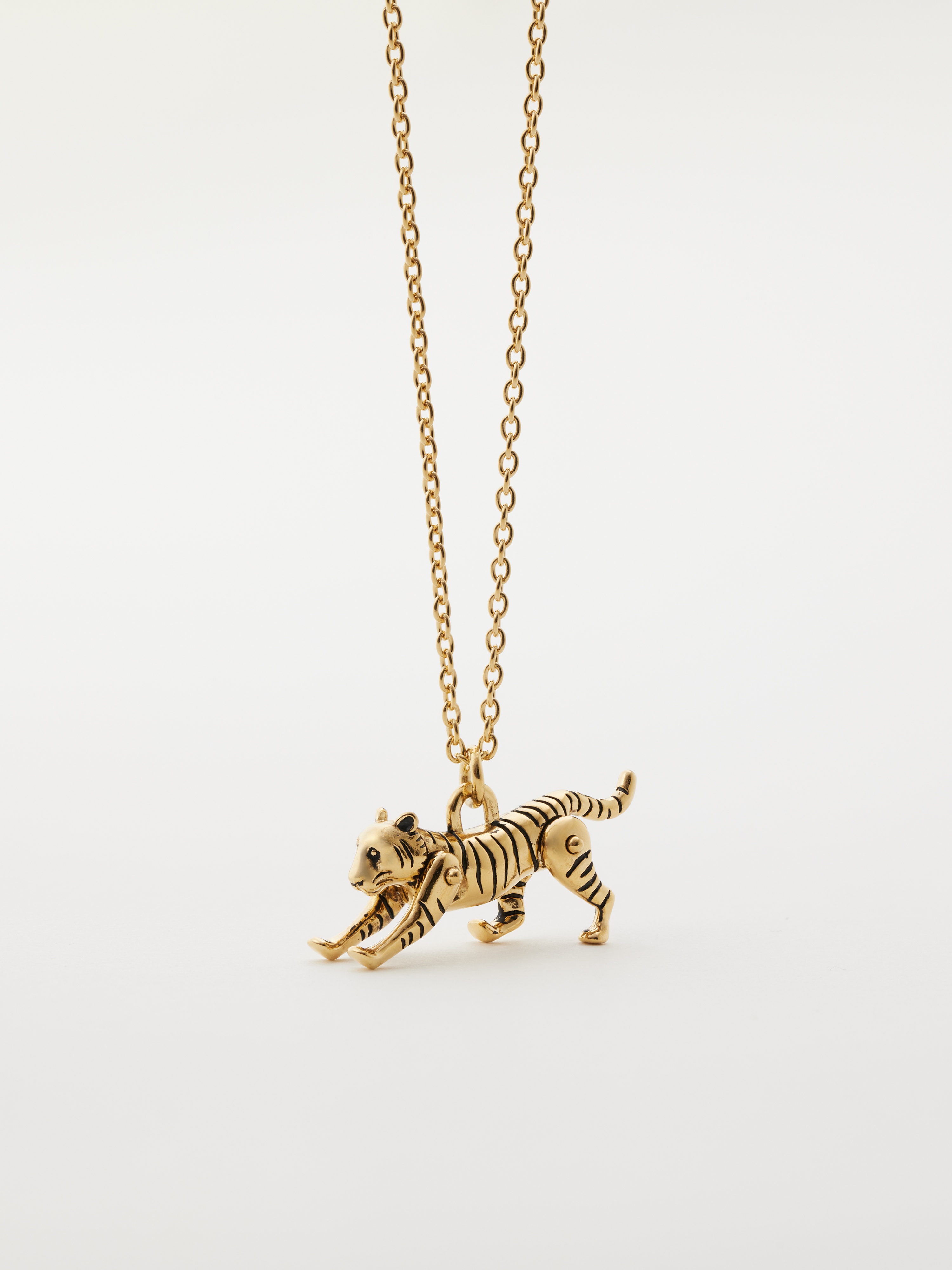 エイジング加工で虎柄を表現し、出足が動くようデザインされました。チャームのネックレスは長さが調節可能で、シルバーとゴールドの2色展開です。