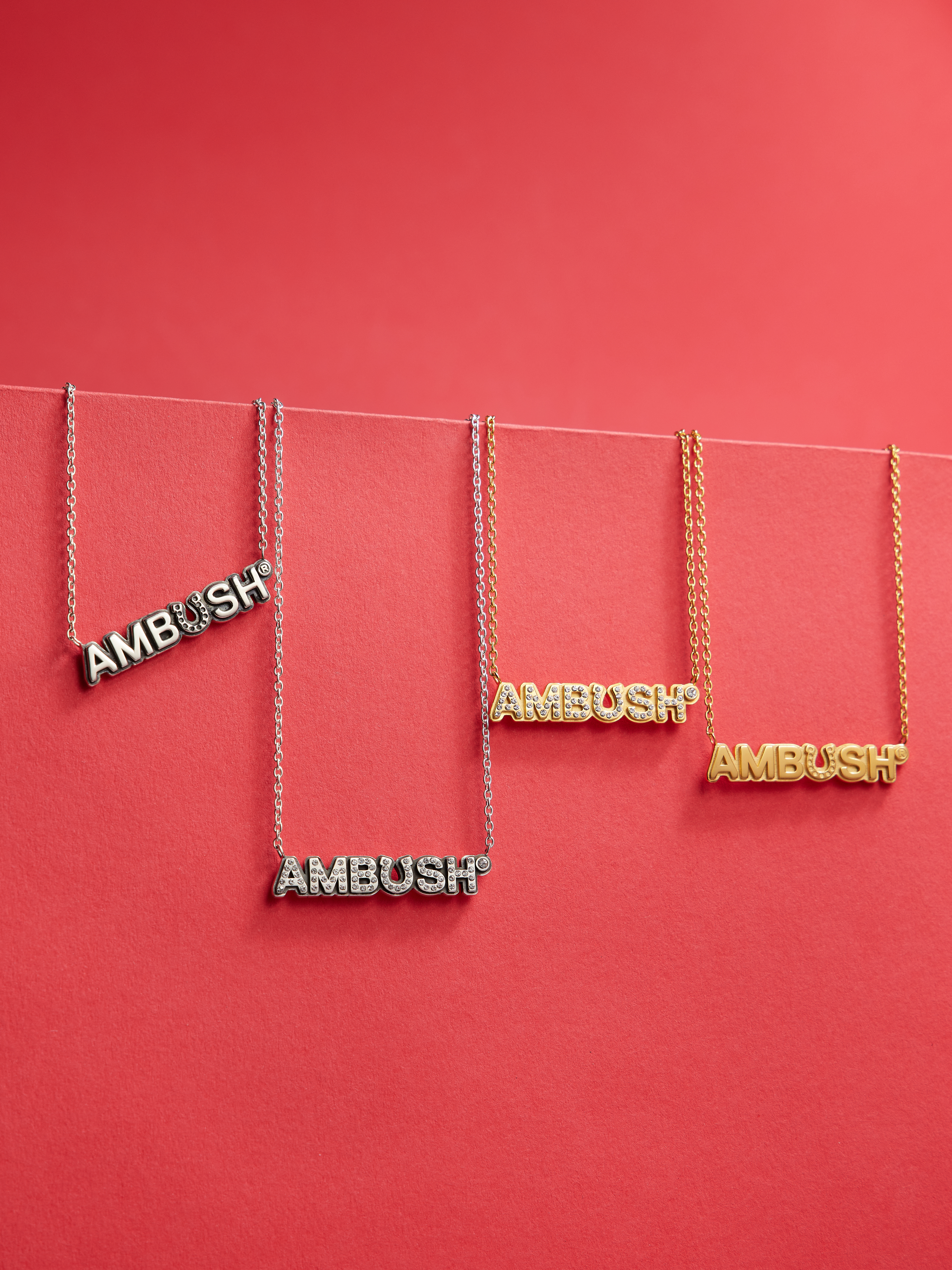 A longstanding symbol of moving forward, ambition, and success, the Horse has carried wishes and good fortune across generations. Reworking this motif through a contemporary lens, the necklace transforms the horseshoe into a distinctive interpretation of AMBUSH®︎’s by replacing the “U” in the logo. Designed as a clean plate silhouette, the piece is offered in two variations: a sleek plain finish and a crystal pavé version, each available in gold and silver.