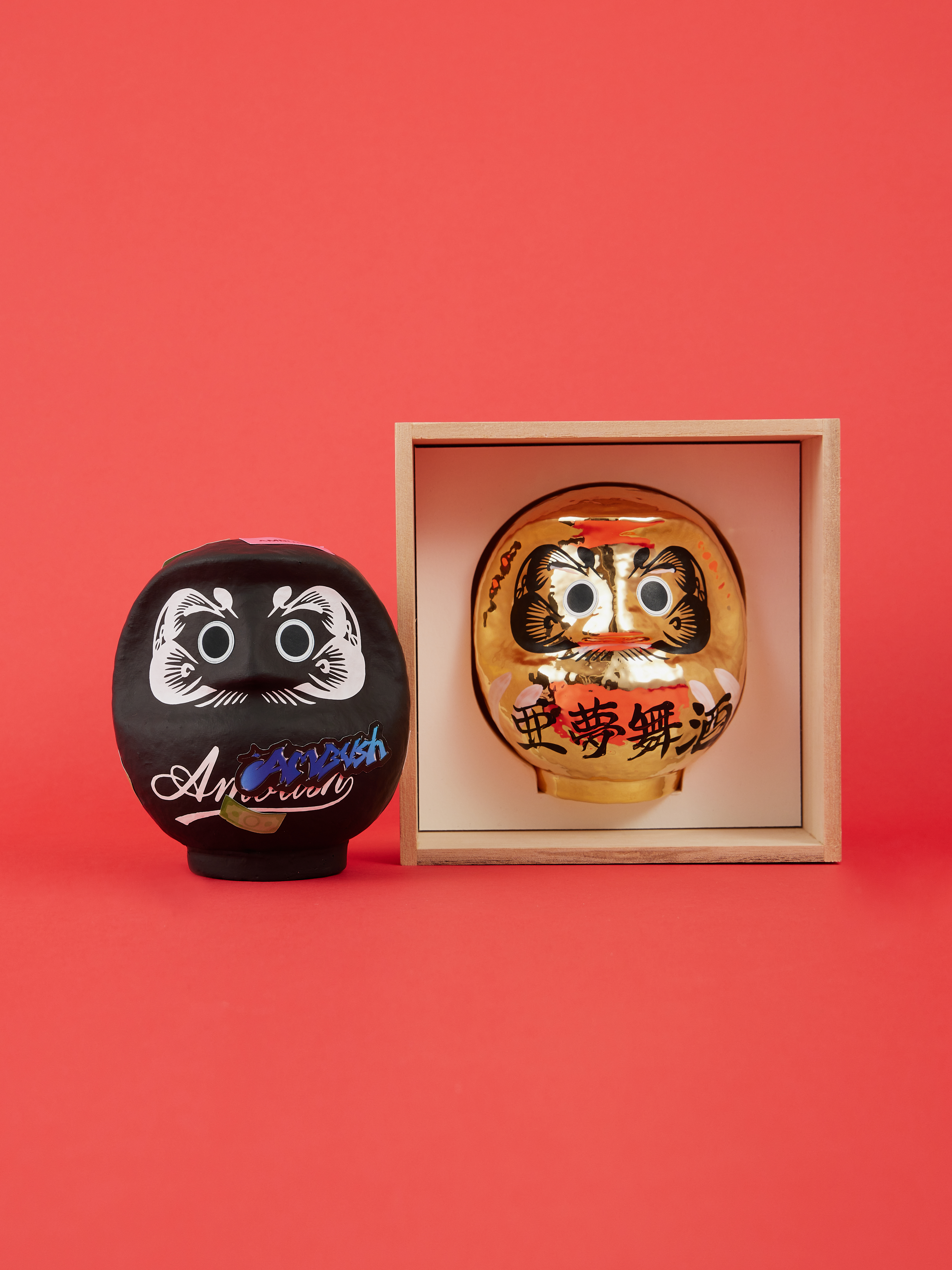 The AMBUSH®︎ New Year Daruma returns in a compact form, presented in gold and black. The gold version features the brand name rendered in kanji—亜夢舞酒 (AMBUSH)—while the black version is boldly marked with an AMBUSH®︎ sticker, creating a striking, singular expression. Each Daruma is crafted in Takasaki, Gunma, a city known for its Daruma-making heritage, and comes packaged in a custom paulownia wood box with the brand logo, accompanied by eye stickers.