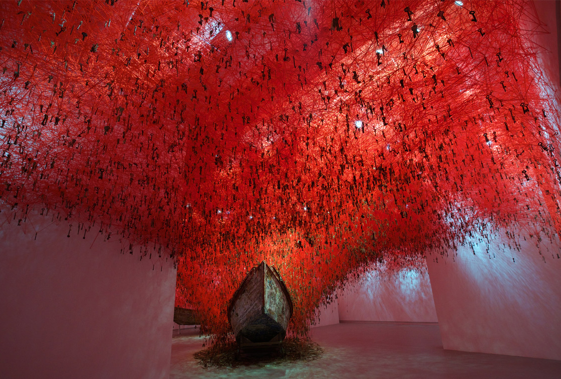 The Key in the Hand, 2015. Installation: old keys, wooden boats, red wool. Japan Pavilion at 56th Venice Biennale, Venice, Italy | Photo Sunhi Mang ©