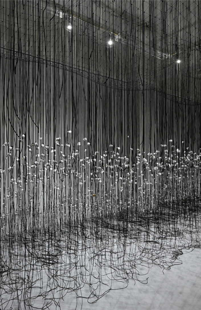 塩田氏のインスタレーションを訪れることは、まるで別の現実に踏み込んだかのような体験に似ている。一見馴染みのある素材やオブジェクトを、未知の領域から由来する複雑なウェブ構造に編み込む。そんな作品を目の前にすると、心と身体に言葉では言い表せない”跡”を確かに残していくのだ。