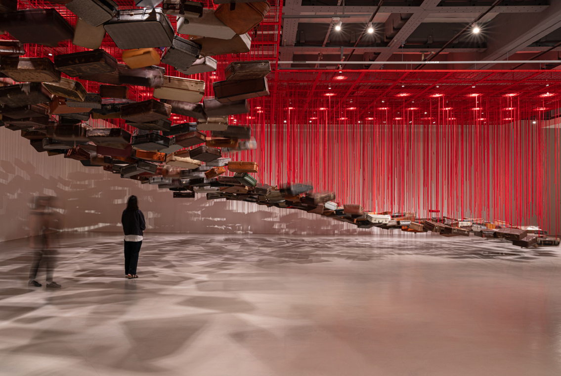 Accumulation-Searching for the Destination, 2014/2021. Suitcase, motor, red rope. Installation view: Shiota Chiharu:The Soul Trembles, Taipei Fine Arts Museum,