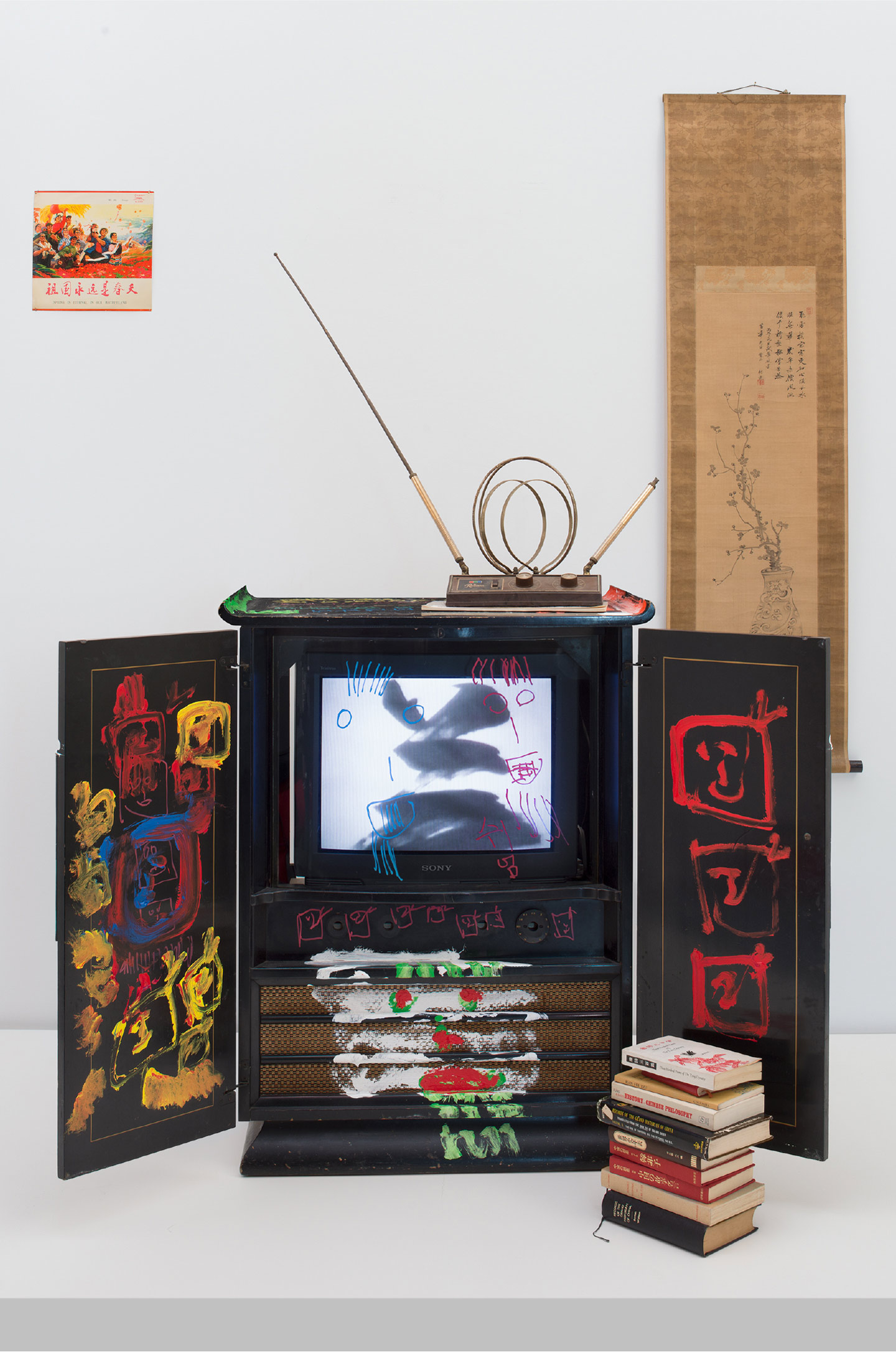 cabinet with permanent oil marker, acrylic, record cover, scroll, antennae, and books