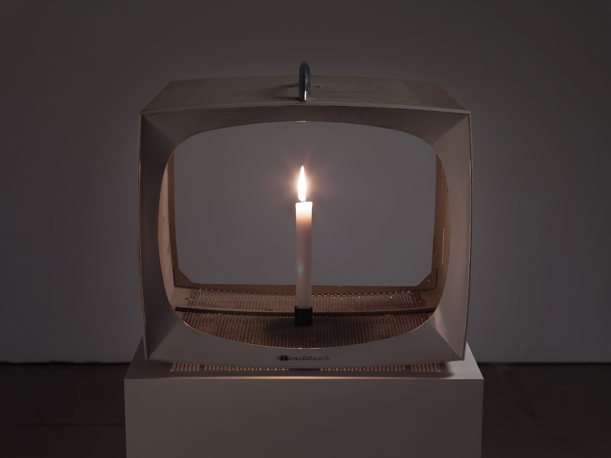 Nam June Paik, Candle TV, 1991 - 2003 Vintage metal television housing with permanent oil marker and lit candle 15 x 16 3/8 x 14 7/8 inches © Nam June Paik Estate