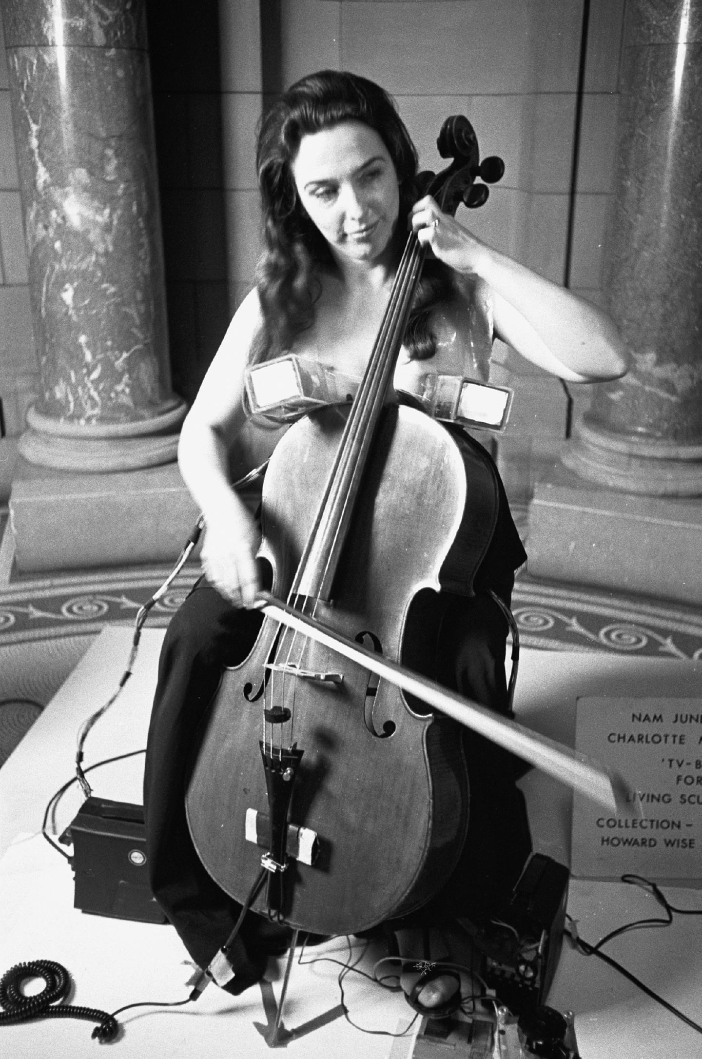 Charlotte Moorman performing Nam June Paik’s TV Bra for Living Sculpture at the Art Gallery of