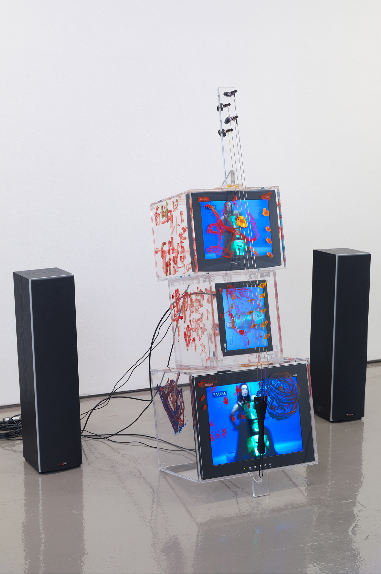acrylic, plexiglass, metal, wood, rubber, cables, solid state media player, remote, power converter, adapter, power amplier and two speakers - Overall Dimensions Variable © Nam June Paik Estate