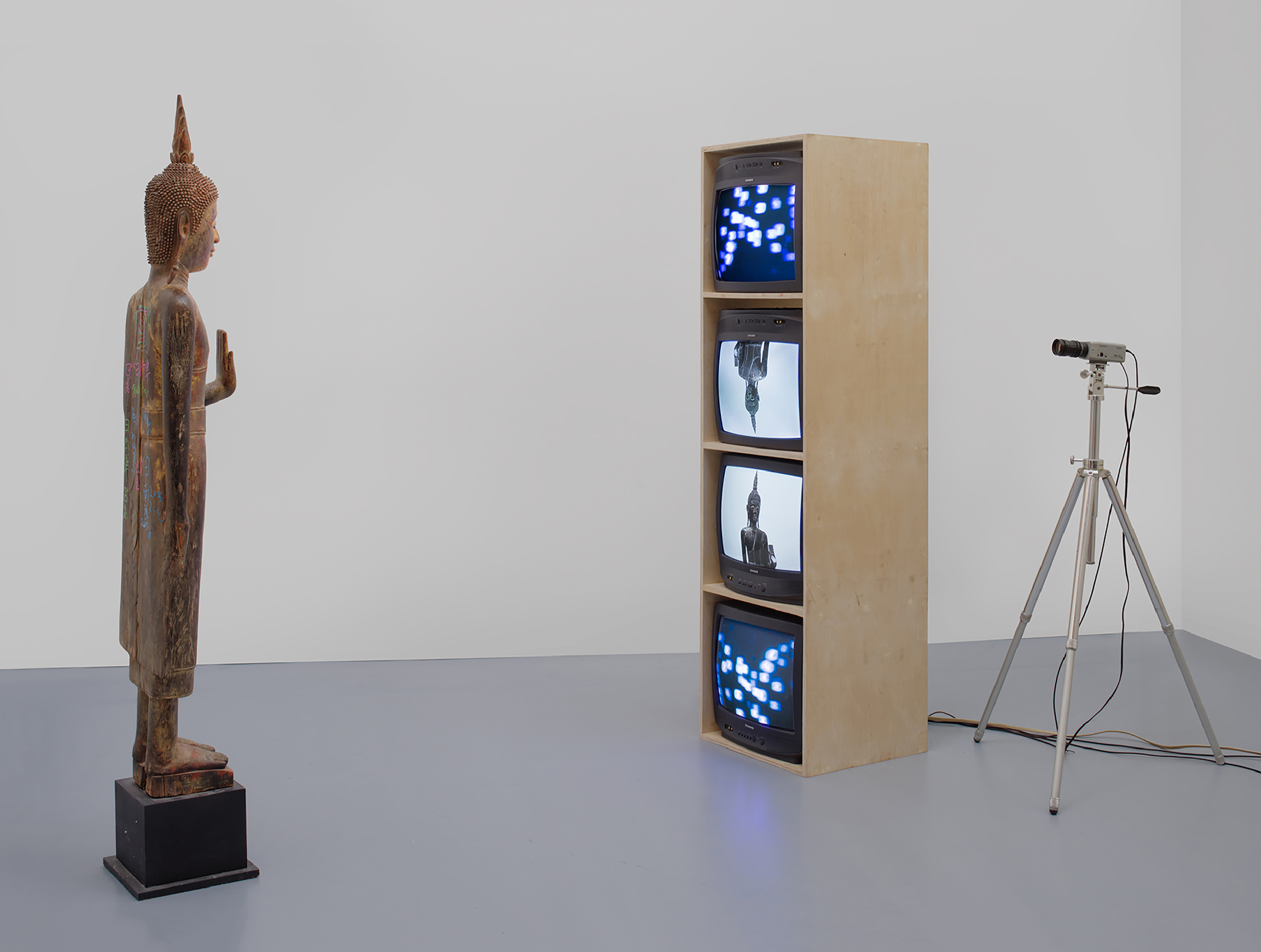 (color, silent) with televisions, closed-circuit video (color), and wood Buddha with