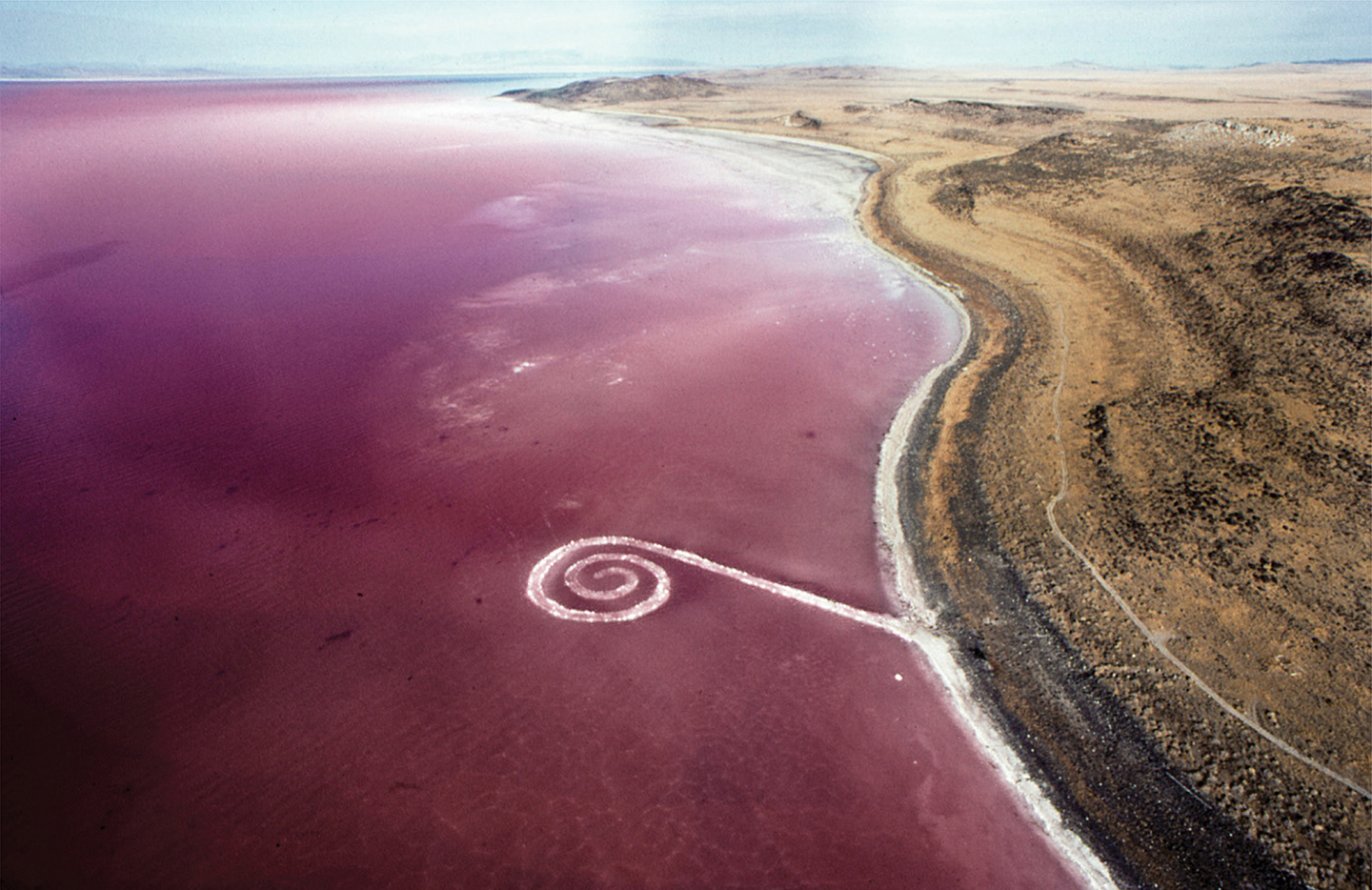 1970年、アメリカの彫刻家のロバート・スミッソンはユタ州ローゼル・ポイント付近でグレートソルト湖に6,650トンの岩石、塩の結晶、玄武岩、泥、土を投棄し、それらを使って北東側の岸から水中に伸びる幅15フィート、長さ1,500フィートの壮大な渦巻きを形成した。「Spiral Jetty」と名付けられたこの作品は、人類と母なる自然との壮大で儚いコラボレーションだったーースミッソンは自分が自然をコントロールできないことを知っていた。かつて彼は「自然は一直線に進むのではなく、むしろ広がりのある展開を見せる」と述べた。完成後まもなく、「Spiral Jetty」は湖に沈み、塩の満ち引きによって周期的に現れたり消えたりした。
