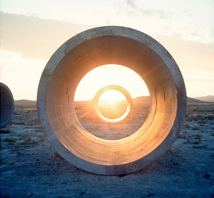 ナンシー・ホルトの「Sun Tunnels」(1973-76)は十字形に配置され、上半分に様々な大きさの穴が開けられた4本の26メートルの長さのコンクリート製の円柱で構成されている。それぞれの穴は、空の星座および冬至と夏至の間の日の入りに合わせて開けられている。そしてホルトは、これらのトンネルを広大な砂漠のなかで鑑賞者を導く「方向付けの装置」と説明している。「Sun Tunnels」の驚くべき点は、その巨大さだけでなく、見る人に熟考と忍耐を促すことだ。ホルトは「この作品はある一定の時間内でしか見ることができないーー単に見て、理解し、立ち去ることができるようなものではない」と語った。