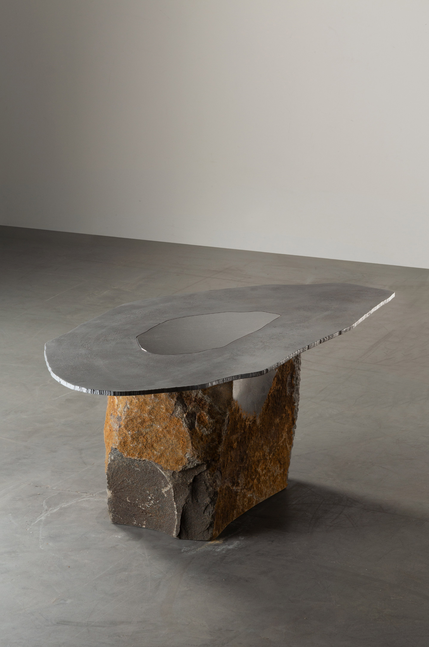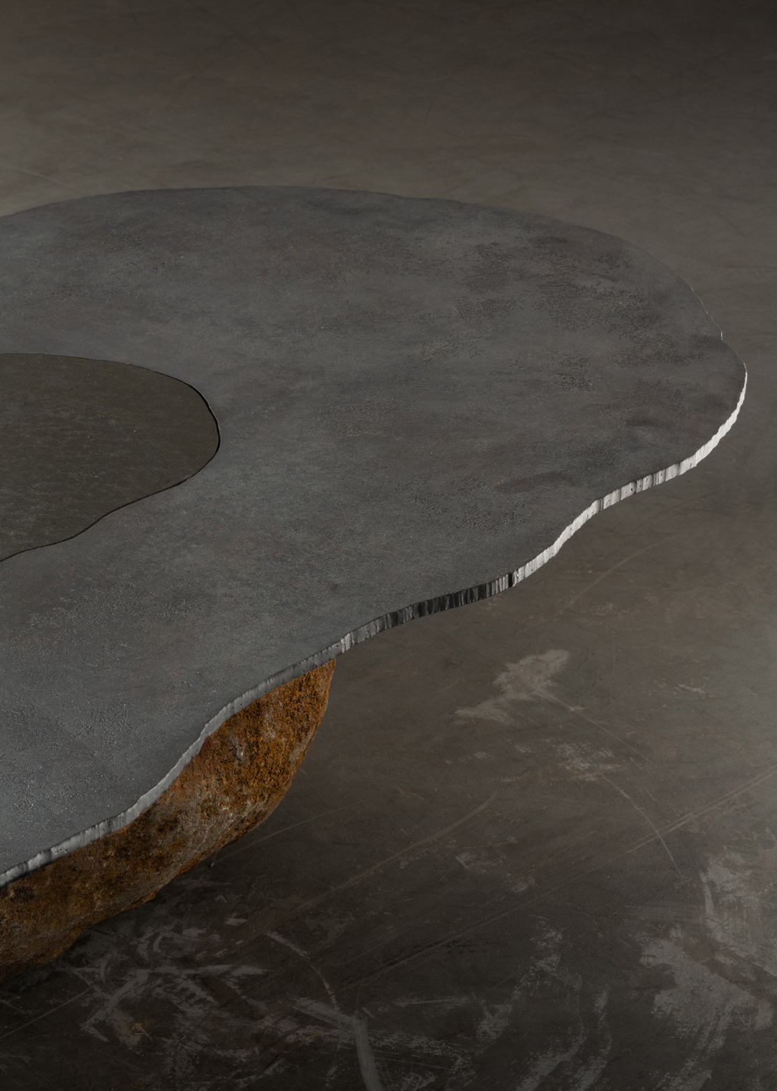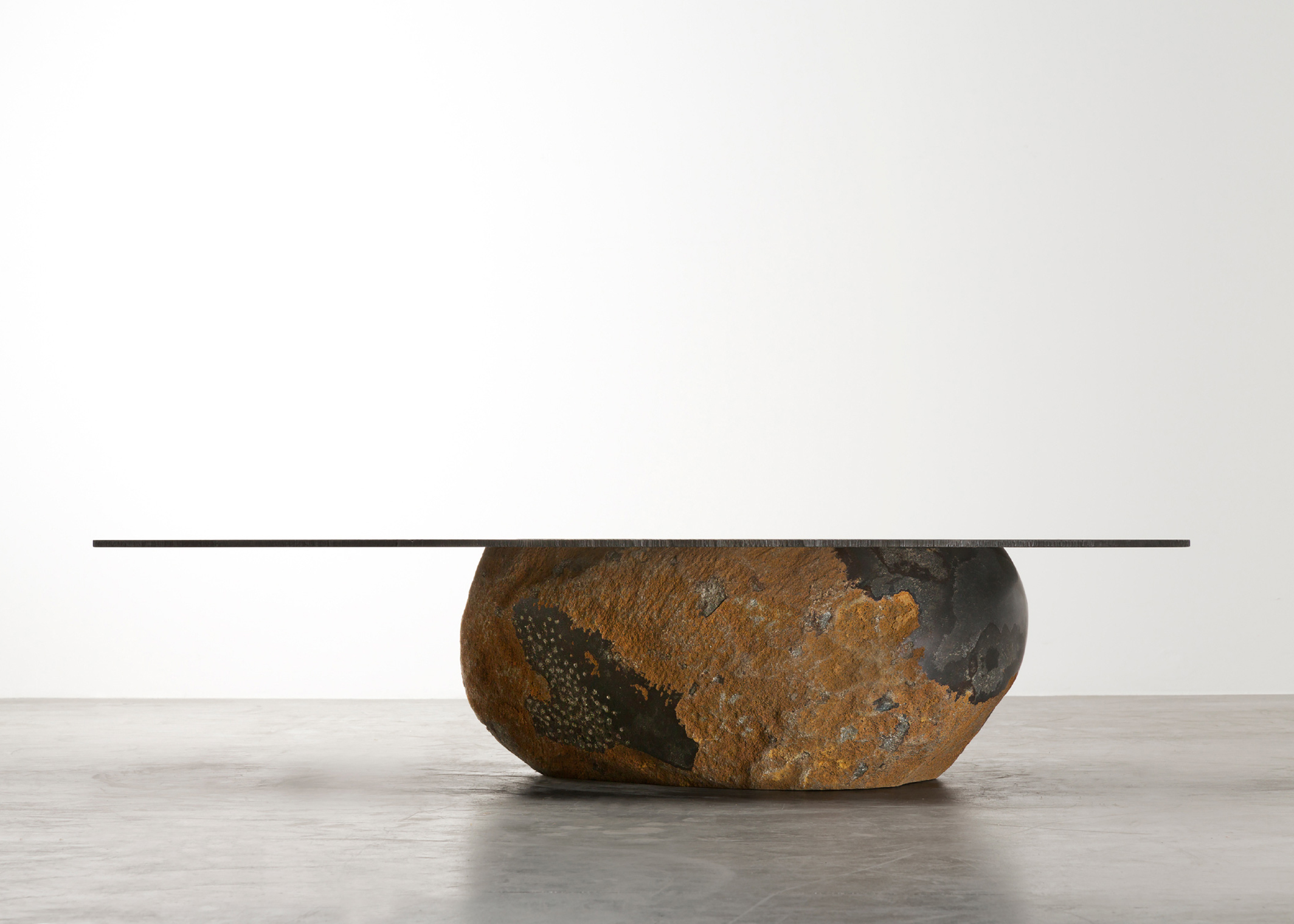 彼の最初のシリーズ「Haze」では、当時は家具にはあまり用いられなかった意外な素材、レジンを使って、非対称のボリュームを持つ、柔らかく淡い色彩のスツールやテーブルを発表した。これらの作品は、その不透明性と透明性は、不確実性、両義性、曖昧さを喚起させる。彼の2つめのシリーズ「Plain Cuts」は、滑らかでシャープなスチールとアルミが対照的に並置されている家具だ。今回、パクは最新作「Stone+Steel」を発表し、石とスチールを使って有機的なフォルムと自然なシルエットを表現した。シェフと同じように、選んだ素材によって、彼のデザインアプローチは決まる。「あらゆる素材や技術に興味があります。それは、感情や感覚を表現するもうひとつの言語なのです。様々な素材を使って実験します」と彼は語り、「素材の魅力や、素材が持つ特性を研究します。それから、その特徴をどのように表現し、技術を使ってどのように素材に反映させるかを考えます」と付け加えた。