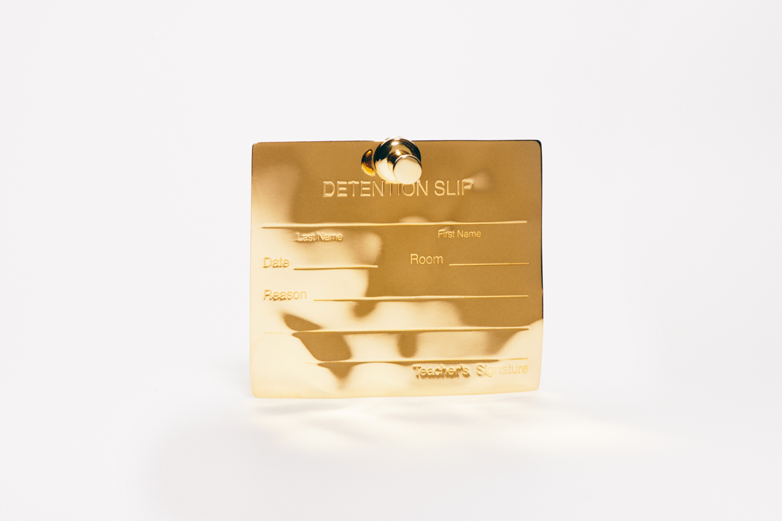 The AMBUSH® Detention Pinは、この反抗的なエネルギーと大胆不敵な態度を表現しています。くしゃくしゃの紙からキャスト・シルバーに変わった居残り通知票のピンバッジは、「常にルールを守らなくても大丈夫」という明確なメッセージを伝えています。