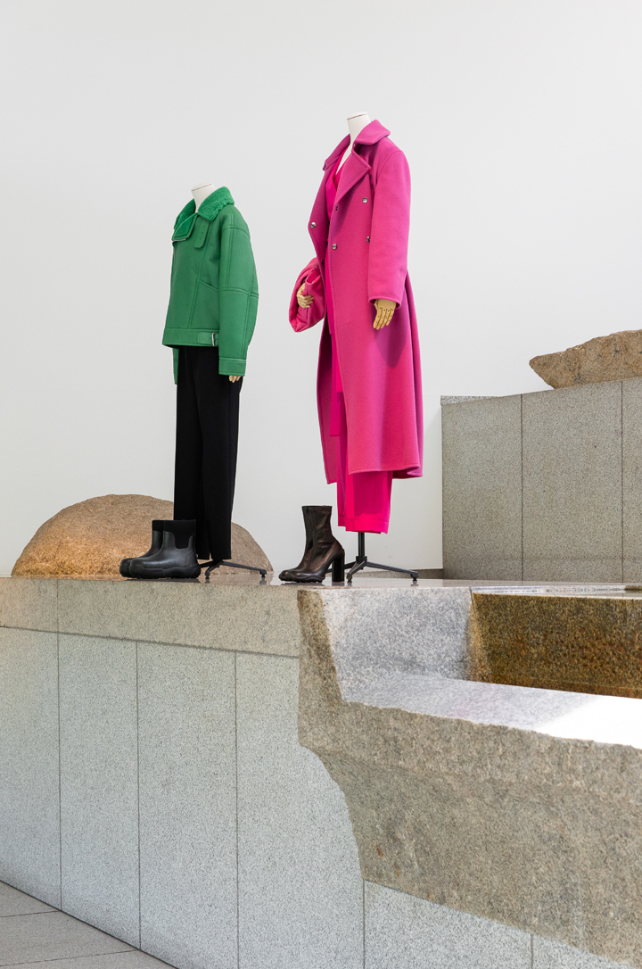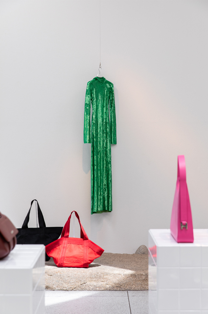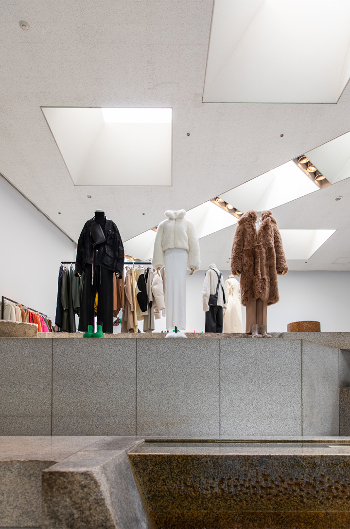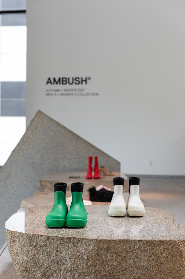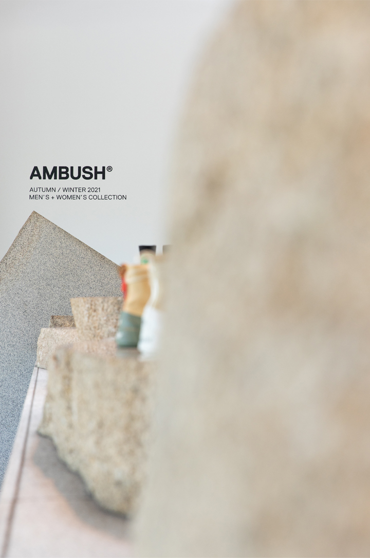 花崗岩の段を伝って水が流れ落ち、AMBUSH®のコート、レザーバッグ、ブーツなどが石の彫刻の上に置かれ、溢れる光の中でジュエリーが輝いています。現代的なデザインと彫刻的な建築が調和した、稀に見る完璧な組み合わせです。
