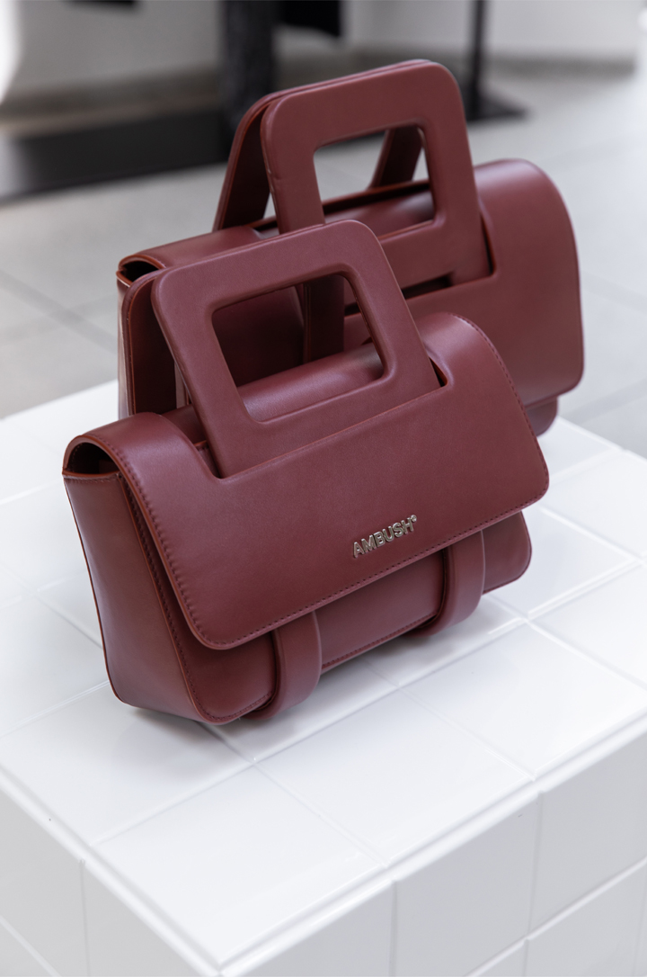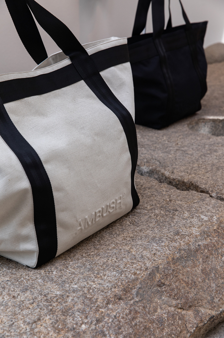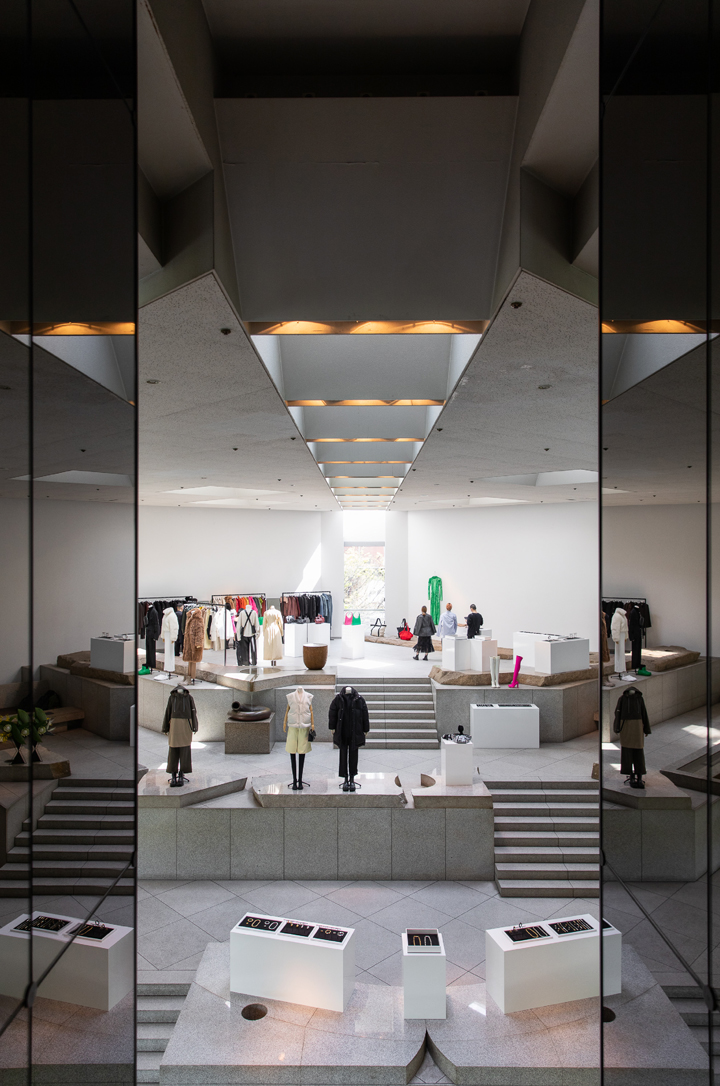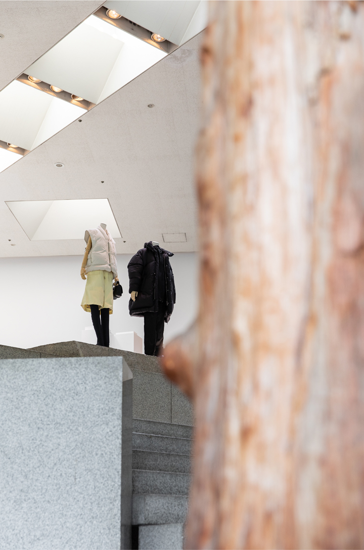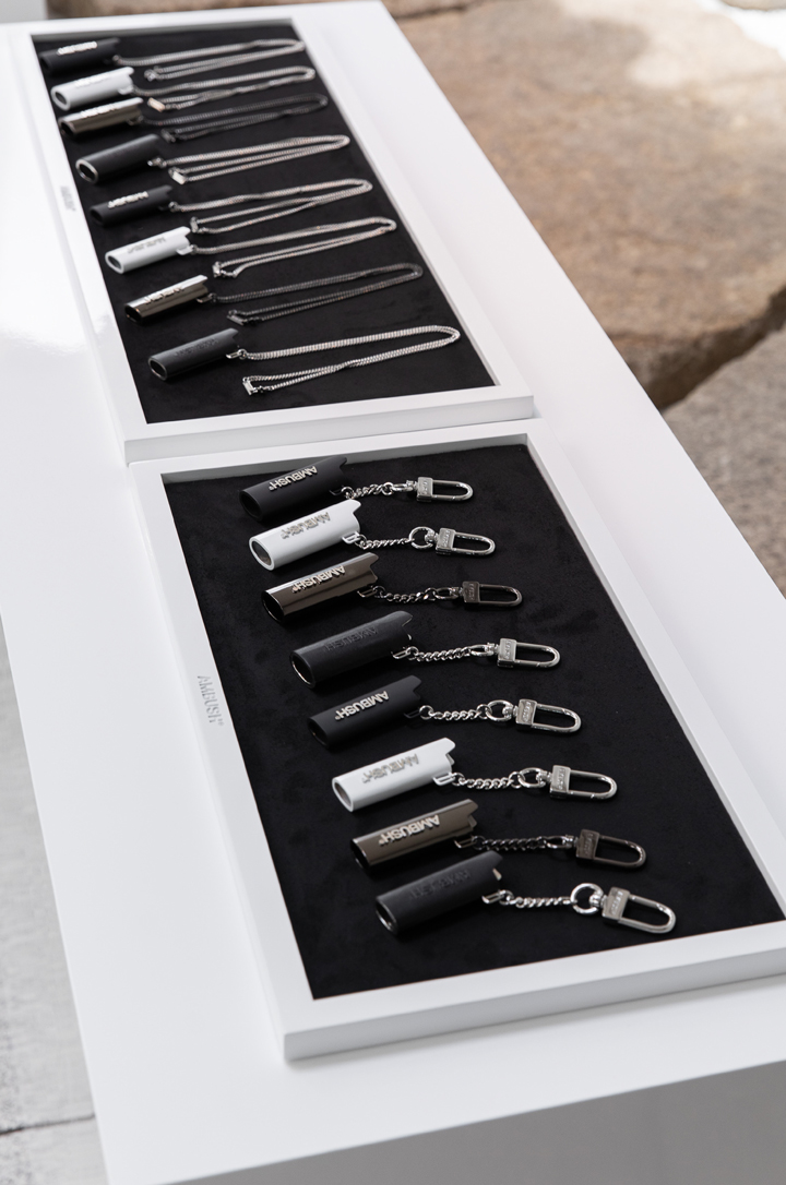 花崗岩の段を伝って水が流れ落ち、AMBUSH®のコート、レザーバッグ、ブーツなどが石の彫刻の上に置かれ、溢れる光の中でジュエリーが輝いています。現代的なデザインと彫刻的な建築が調和した、稀に見る完璧な組み合わせです。