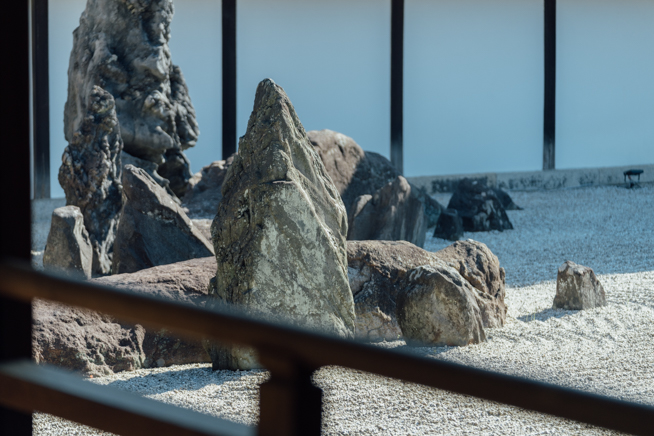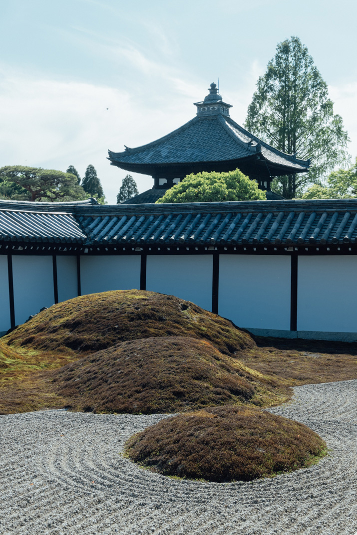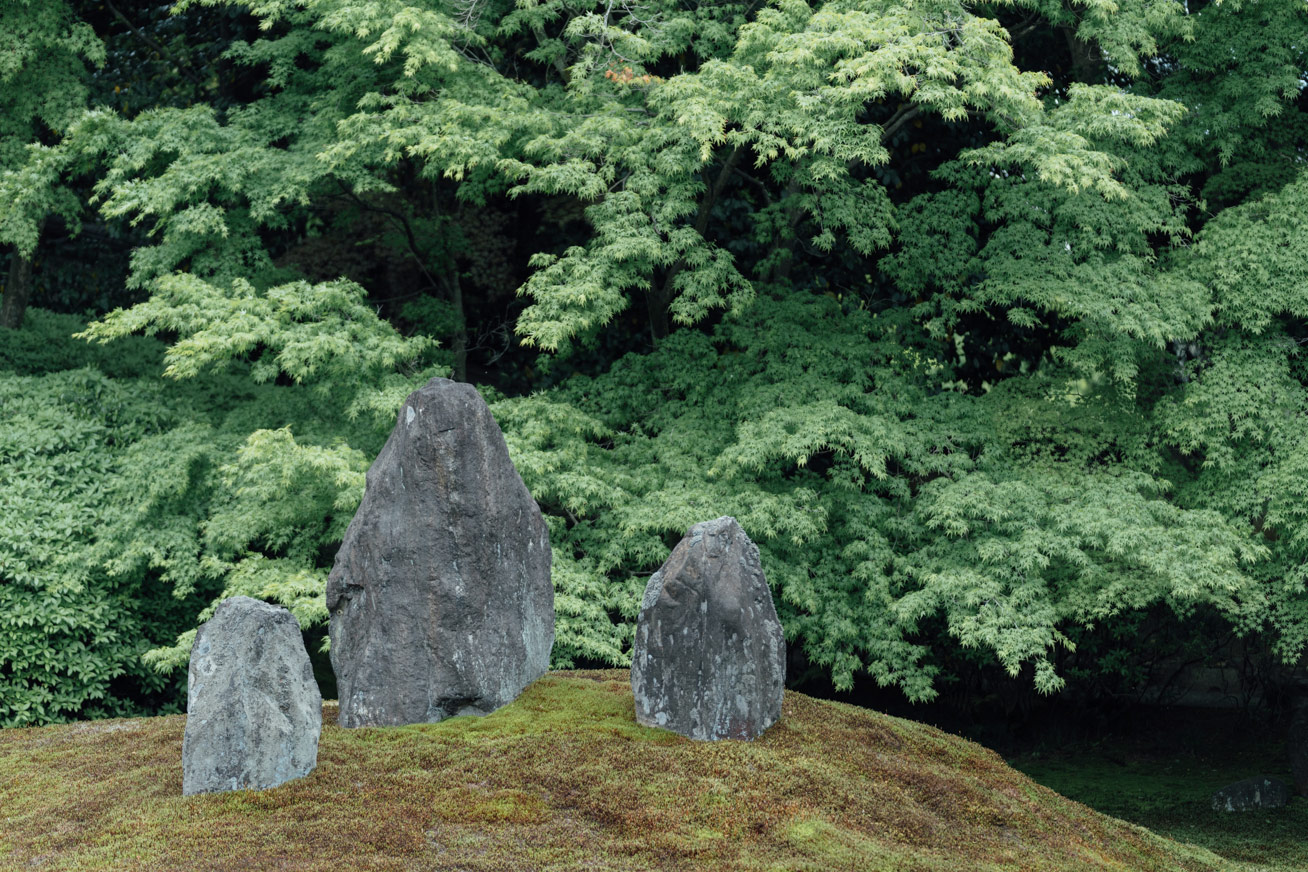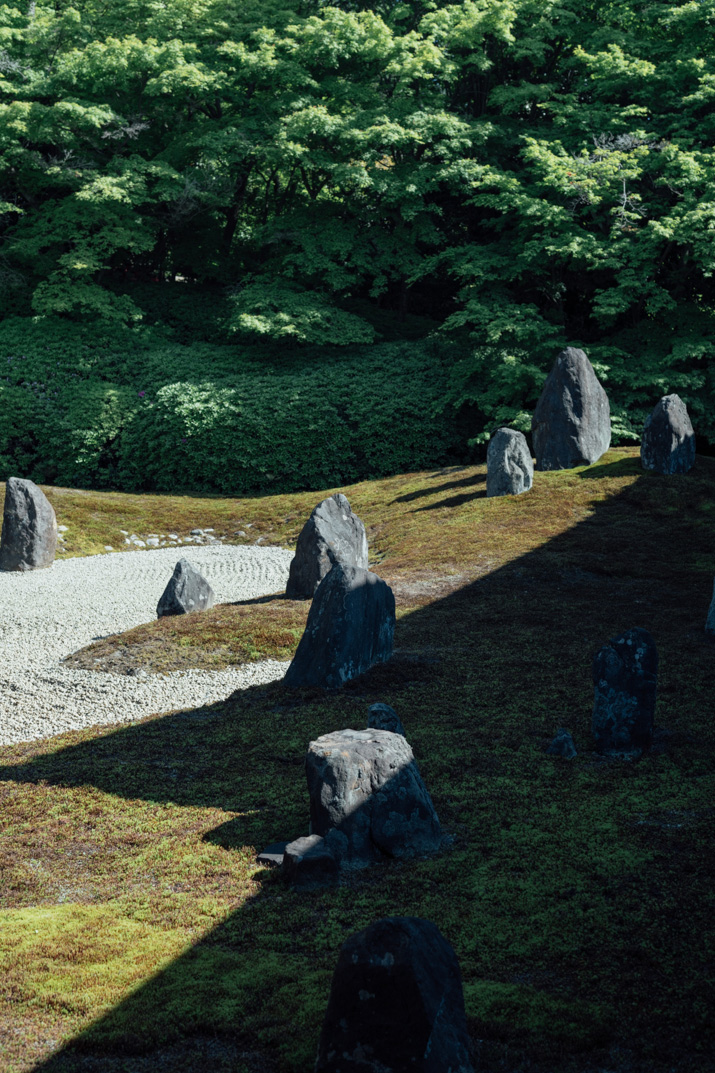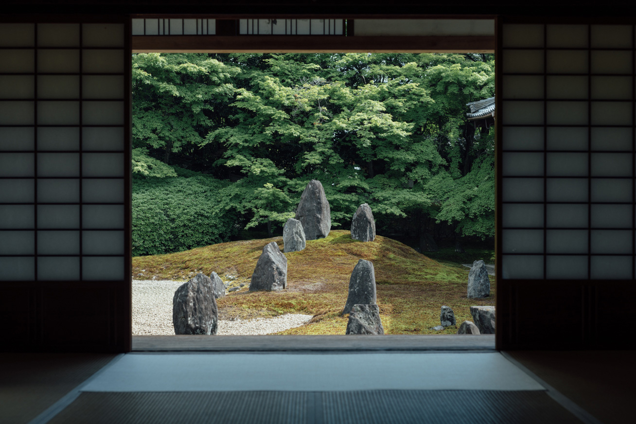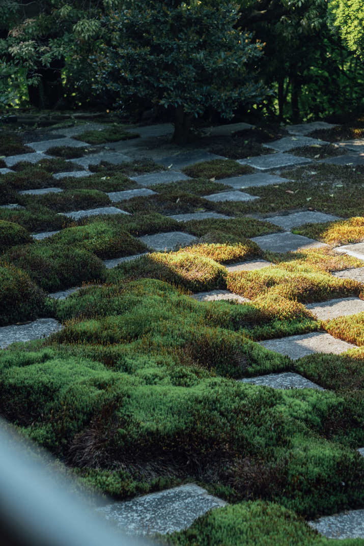 「この庭園を見ても、いつ作庭されたのかが分かりません。作風が永遠にモダンだからです。それが重盛のコンセプトでした」光明院の住職、藤田さんは私達に境内の案内をしつつ、微笑みながら語った。話題の的になっている「時代感の無い」庭園の正体は波心庭だ。1939年に作られたこの京都の庭園は秋の紅葉、浮き出る苔の線、そして躍動感溢れる石の配置が特徴的だ。この庭園は唯一無二の手作業により厳選された石が75個用いられており、計算し尽くされた配置と設計がなされているにも関わらず、どういう訳か作者の自由かつ奔放な精神を見事に表現している。その作者こそが、偉大なる重森三玲(1896-1975)である。