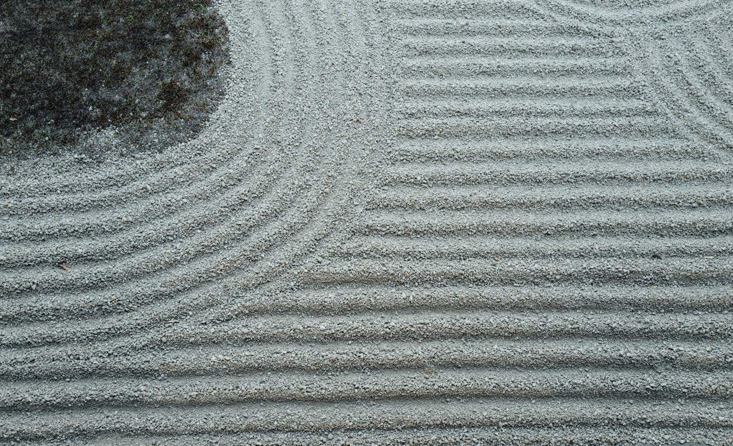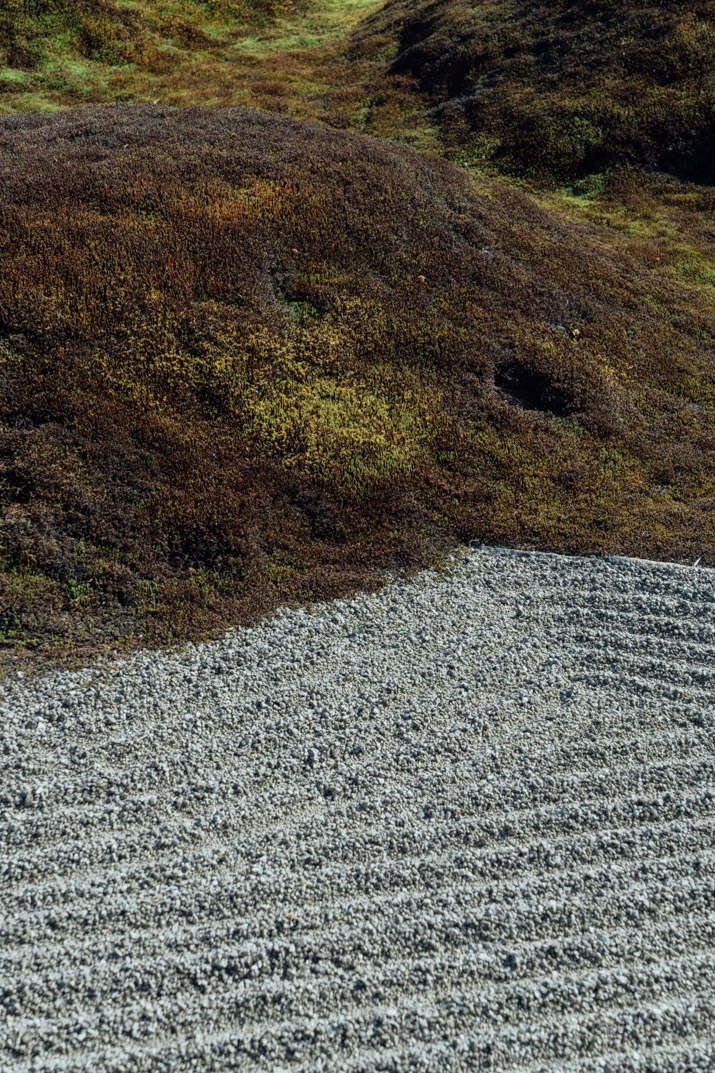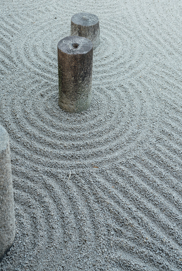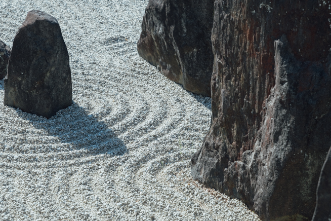 まずは彼の石の使い方だ。重森は石の使用を好み、彼の手法は単なる石ころをあたかも前衛的な彫刻かのごとく、芸術作品に変えるのだった。1つの石から伝わる物語はないかもしれないが、それが石庭となり、作品は完成し、混沌の中にある種の調和とバランスをもたらすのだ。重森の地面の層のデザイン法も同等に重要だった。単純に思えるかもしれないが、直線における白砂と苔の使用法はモダンさを演出した。それと共に斜線を使用する事により躍動感を表現し、それが日本庭園に革命をもたらしたのだった。